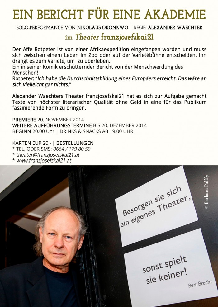 2014 Ein Bericht für eine Akademie von Franz Kafka mit Nikolaus Okonkwo Premiere, 20. November 2014 – 20. Dezember 2014 16 Vorstellungen Fotos © Barbara Pálffy